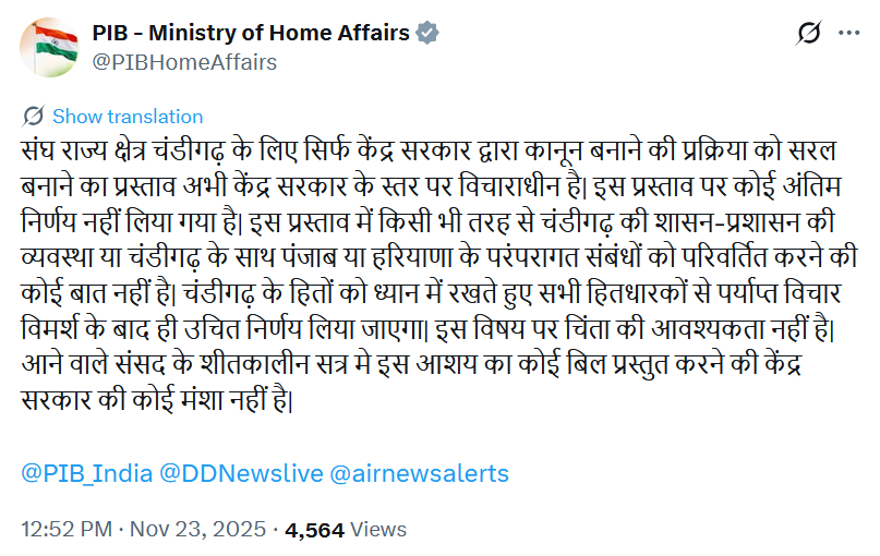 ਕੇਂਦਰ ਸਰਕਾਰ ਦੇ ਬੁਲਾਰੇ ਨੇ ਵਜਾਹ ਦਿੰਦੇ ਕਿਹਾ ਕਿ ਇਹ ਸਿਰਫ਼ ਵਿਧਾਨਕ ਪ੍ਰਕਿਰਿਆ ਨੂੰ ਸੁਗਮ ਬਣਾਉਣ ਲਈ ਇੱਕ ਸ਼ੁਰੂਆਤੀ ਸੂਝ ਸੀ। ਨਾ ਹੀ ਚੰਡੀਗੜ੍ਹ ਦੇ ਸ਼ਾਸਕੀ ਢਾਂਚੇ ਵਿੱਚ ਕੋਈ ਬਦਲਾਅ ਤੈਅ ਕੀਤਾ ਗਿਆ ਹੈ ਅਤੇ ਨਾ ਹੀ ਪੰਜਾਬ-ਹਰਿਆਣਾ ਦੇ ਮੌਜੂਦਾ ਸਬੰਧਾਂ ‘ਚ ਹਸਤਖਸ਼ੇਪ ਦੀ ਕੋਈ ਯੋਜਨਾ ਹੈ।