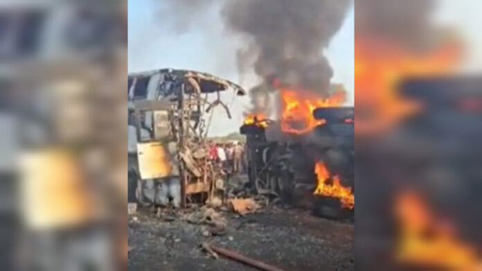 ਆਂਧਰਾ ਪ੍ਰਦੇਸ਼ :- ਆਂਧਰਾ ਪ੍ਰਦੇਸ਼ ਦੇ ਮਾਰਕਾਪੁਰਮ ਇਲਾਕੇ ਵਿੱਚ ਰਾਏਵਰਮ ਦੇ ਨੇੜੇ ਇੱਕ ਦਿਲ ਦਹਿਲਾ ਦੇਣ ਵਾਲਾ ਸੜਕ ਹਾਦਸਾ ਵਾਪਰਿਆ, ਜਿੱਥੇ ਨਿੱਜੀ ਟ੍ਰੈਵਲ ਬੱਸ ਅਤੇ ਟਿੱਪਰ ਦੀ ਭਿੜੰਤ ਤੋਂ ਬਾਅਦ ਭਿਆਨਕ ਅੱਗ ਲੱਗ ਗਈ। ਟੱਕਰ ਇੰਨੀ ਤੀਬਰ ਸੀ ਕਿ ਦੋਵਾਂ ਵਾਹਨਾਂ ਨੂੰ ਤੁਰੰਤ ਅੱਗ ਨੇ ਘੇਰ ਲਿਆ ਅਤੇ ਕੁਝ ਹੀ ਸਮੇਂ ਵਿੱਚ ਬੱਸ ਪੂਰੀ ਤਰ੍ਹਾਂ ਸੜ ਕੇ ਖਾਕ ਹੋ ਗਈ।