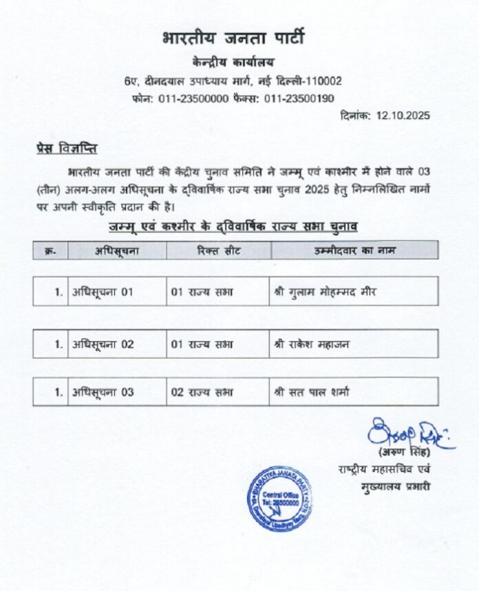ਜਮੂੰ :- ਭਾਰਤੀ ਜਨਤਾ ਪਾਰਟੀ (ਭਾਜਪਾ) ਨੇ ਐਤਵਾਰ ਨੂੰ ਕੇਂਦਰ ਸ਼ਾਸਿਤ ਪ੍ਰਦੇਸ਼ ਜੰਮੂ-ਕਸ਼ਮੀਰ ਵਿੱਚ ਚਾਰ ਰਾਜ ਸਭਾ ਸੀਟਾਂ ਲਈ ਤਿੰਨ ਉਮੀਦਵਾਰਾਂ ਦੀ ਸੂਚੀ ਜਾਰੀ ਕੀਤੀ। ਚੋਣਾਂ 24 ਅਕਤੂਬਰ ਨੂੰ ਹੋਣ ਜਾ ਰਹੀਆਂ ਹਨ। ਉਮੀਦਵਾਰਾਂ ਵਿੱਚ ਪਾਰਟੀ ਦੇ ਜੰਮੂ-ਕਸ਼ਮੀਰ ਇਕਾਈ ਪ੍ਰਧਾਨ ਸਤਪਾਲ ਸ਼ਰਮਾ, ਗੁਲਾਮ ਮੁਹੰਮਦ ਮੀਰ ਅਤੇ ਰਾਕੇਸ਼ ਮਹਾਜਨ ਸ਼ਾਮਿਲ ਹਨ। ਚੋਣ ਕਮਿਸ਼ਨ ਨੇ ਚਾਰ ਸੀਟਾਂ ‘ਤੇ ਚੋਣਾਂ ਲਈ ਤਿੰਨ ਵੱਖ-ਵੱਖ ਨੋਟੀਫਿਕੇਸ਼ਨ ਜਾਰੀ ਕੀਤੇ ਹਨ।