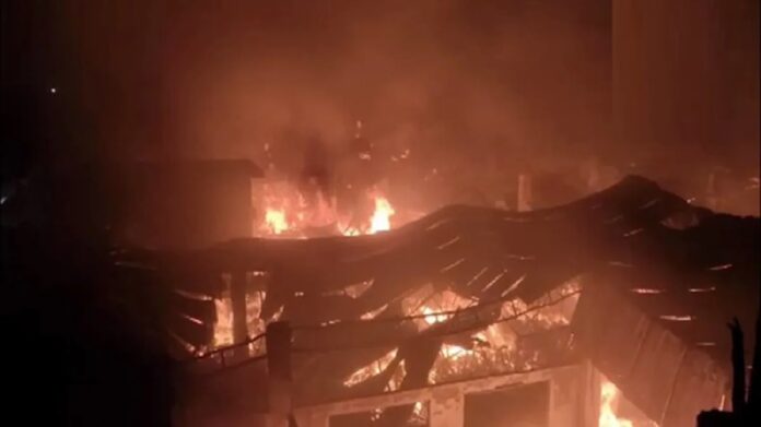 ਮਹਾਰਾਸ਼ਟਰ :- ਮਹਾਰਾਸ਼ਟਰ ਦੇ ਠਾਣੇ ਜ਼ਿਲ੍ਹੇ ਦੇ ਭਿਵੰਡੀ ਸ਼ਹਿਰ ਵਿੱਚ ਮੰਗਲਵਾਰ ਅੱਧੀ ਰਾਤ ਇੱਕ ਭਿਆਨਕ ਅੱਗ ਨੇ ਹੜਕੰਪ ਮਚਾ ਦਿੱਤਾ। ਕਲਹੇਰ ਦੇ ਨਾਂਗਰ ਨਗਰ ਵਿਚਲੇ ਰਾਜਲਕਸ਼ਮੀ ਕੰਪਲੈਕਸ ਦੇ ਕੱਪੜੇ ਦੇ ਗੋਦਾਮ ਵਿੱਚ ਅਚਾਨਕ ਲੱਗੀ ਲਪਟਾਂ ਨੇ ਕੁਝ ਮਿੰਟਾਂ ਵਿੱਚ ਹੀ ਪੂਰੇ ਖੇਤਰ ਨੂੰ ਧੂੰਏ ਅਤੇ ਚਮਕਦਾਰ ਅੱਗ ਨਾਲ ਢੱਕ ਦਿੱਤਾ।