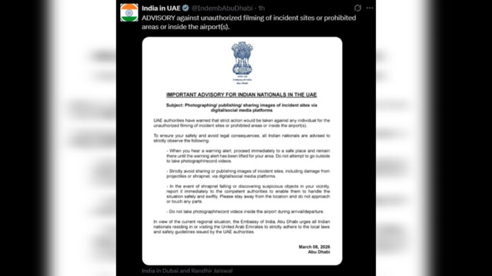 ਦੂਤਾਵਾਸ ਵੱਲੋਂ ਜਾਰੀ ਸੁਚਨਾ ਵਿੱਚ ਕਿਹਾ ਗਿਆ ਹੈ ਕਿ ਦੁਬਈ ਅਤੇ ਅਬੂ ਧਾਬੀ ਸਮੇਤ ਯੂ.ਏ.ਈ. ਦੇ ਕਿਸੇ ਵੀ ਹਵਾਈ ਅੱਡੇ ਦੇ ਅੰਦਰ ਤਸਵੀਰਾਂ ਖਿੱਚਣ ਜਾਂ ਵੀਡੀਓ ਬਣਾਉਣ ਤੋਂ ਪੂਰੀ ਤਰ੍ਹਾਂ ਪਰਹੇਜ਼ ਕੀਤਾ ਜਾਵੇ। ਹਵਾਈ ਅੱਡਿਆਂ ਦੇ ਕਈ ਹਿੱਸੇ ਸੁਰੱਖਿਆ ਦੇ ਨਜ਼ਰੀਏ ਨਾਲ ਸੰਵੇਦਨਸ਼ੀਲ ਮੰਨੇ ਜਾਂਦੇ ਹਨ ਅਤੇ ਉਨ੍ਹਾਂ ਦੀ ਰਿਕਾਰਡਿੰਗ ਸਥਾਨਕ ਕਾਨੂੰਨਾਂ ਦੀ ਉਲੰਘਣਾ ਹੋ ਸਕਦੀ ਹੈ।