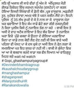 ਇਸ ਕਤਲ ਮਾਮਲੇ ਤੋਂ ਕੁਝ ਘੰਟਿਆਂ ਬਾਅਦ ਗੈਂਗਸਟਰ ਡੌਨੀ ਬੱਲ ਅਤੇ ਪ੍ਰਭ ਦਾਸੂਵਾਲ ਦੇ ਨਾਮਾਂ ਨਾਲ ਇੱਕ ਸੋਸ਼ਲ ਮੀਡੀਆ ਪੋਸਟ ਸਾਹਮਣੇ ਆਈ, ਜਿਸ ਵਿੱਚ ਇਸ ਹੱਤਿਆ ਦੀ ਜ਼ਿੰਮੇਵਾਰੀ ਲੈਣ ਦਾ ਦਾਅਵਾ ਕੀਤਾ ਗਿਆ। ਹਾਲਾਂਕਿ ਪੁਲਿਸ ਅਤੇ ਮੀਡੀਆ ਵੱਲੋਂ ਇਸ ਪੋਸਟ ਦੀ ਅਜੇ ਤੱਕ ਕੋਈ ਅਧਿਕਾਰਿਕ ਪੁਸ਼ਟੀ ਨਹੀਂ ਕੀਤੀ ਗਈ।