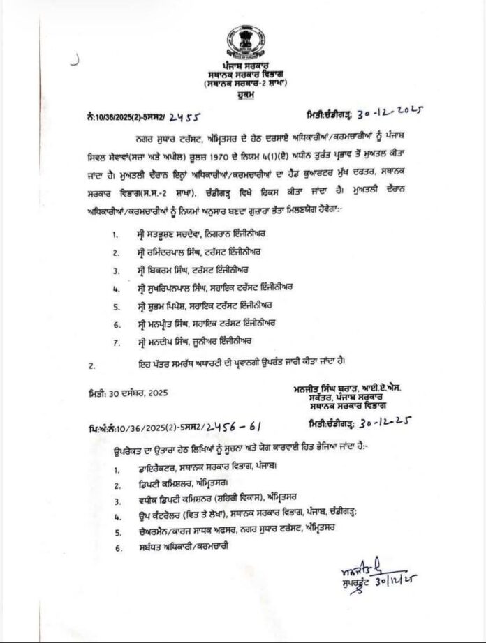 ਅੰਮ੍ਰਿਤਸਰ :- ਪੰਜਾਬ ਸਰਕਾਰ ਦੇ ਸਥਾਨਕ ਸਰਕਾਰੀ ਵਿਭਾਗ ਨੇ ਅੰਮ੍ਰਿਤਸਰ ਦੇ ਰਣਜੀਤ ਐਵੀਨਿਊ ਟੈਂਡਰ ਮਾਮਲੇ ਨੂੰ ਲੈ ਕੇ ਸਖ਼ਤ ਕਦਮ ਚੁੱਕਦੇ ਹੋਏ ਵੱਡੀ ਕਾਰਵਾਈ ਕੀਤੀ ਹੈ। ਵਿਭਾਗ ਵੱਲੋਂ ਇਸ ਮਾਮਲੇ ਨਾਲ ਜੁੜੇ ਸੱਤ ਅਧਿਕਾਰੀਆਂ ਨੂੰ ਤੁਰੰਤ ਪ੍ਰਭਾਵ ਨਾਲ ਮੁਅੱਤਲ ਕਰ ਦਿੱਤਾ ਗਿਆ ਹੈ। ਇਸ ਕਾਰਵਾਈ ਨਾਲ ਪ੍ਰਸ਼ਾਸਨਿਕ ਹਲਕਿਆਂ ਵਿੱਚ ਹਲਚਲ ਮਚ ਗਈ ਹੈ।