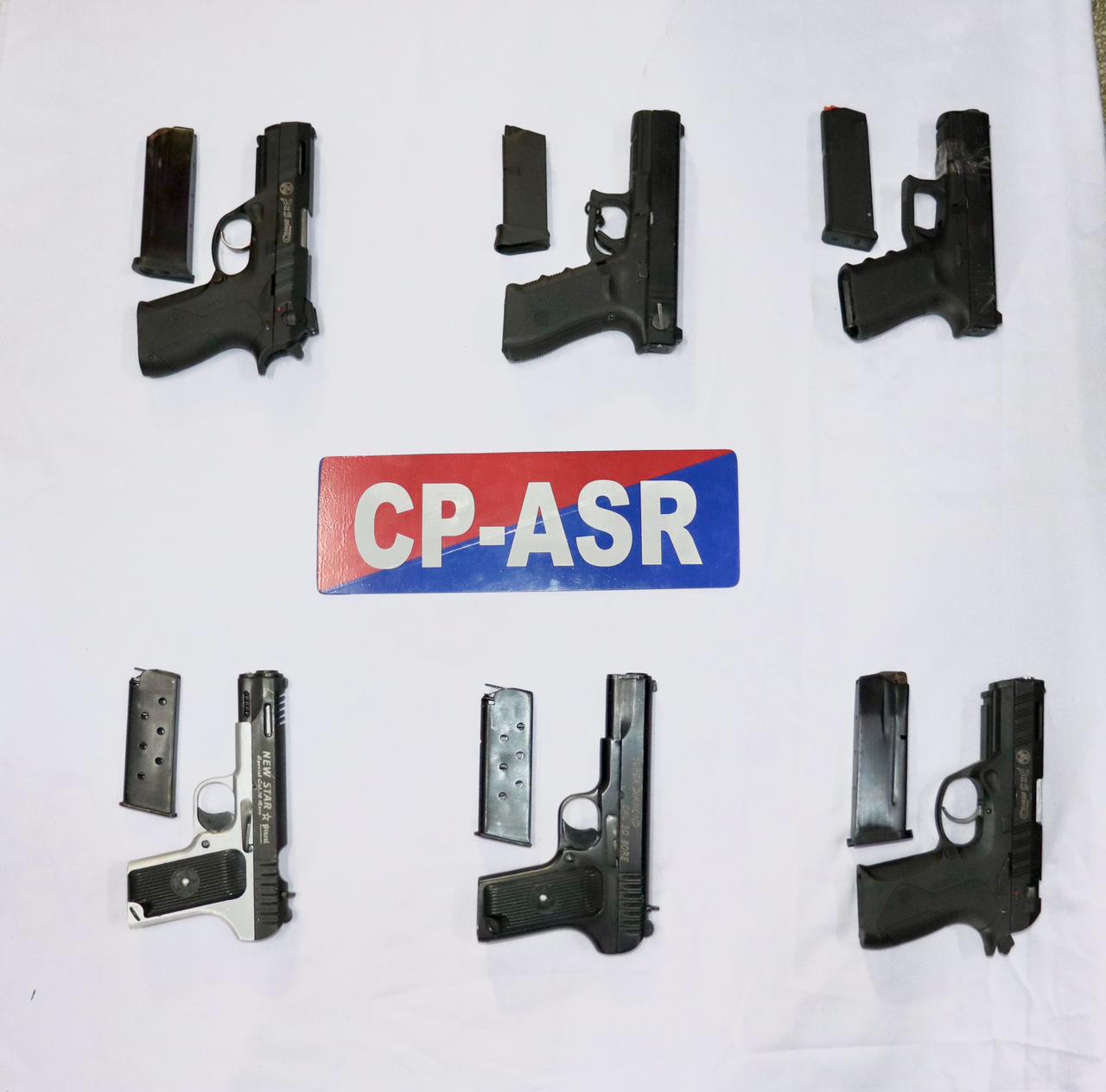 ਅੰਮ੍ਰਿਤਸਰ :- ਅੰਮ੍ਰਿਤਸਰ ਕਮਿਸ਼ਨਰੇਟ ਪੁਲਿਸ ਨੇ ਇੱਕ ਵੱਡੀ ਕਾਰਵਾਈ ਦੌਰਾਨ ਪਾਕਿਸਤਾਨ ਦੀ ਪਿੱਠਬਣੀ ਨਾਲ ਚੱਲ ਰਹੇ ਅੰਤਰਰਾਸ਼ਟਰੀ ਹਥਿਆਰ ਤਸਕਰੀ ਨੈੱਟਵਰਕ ਨੂੰ ਨਿਸ਼ਾਨਾ ਬਣਾਇਆ ਹੈ। ਪੁਲਿਸ ਨੇ ਇਸ ਮੋਡੀਊਲ ਵਿੱਚ ਸ਼ਾਮਲ ਛੇ ਲੋਕਾਂ ਨੂੰ ਕਾਬੂ ਕੀਤਾ ਹੈ, ਜਿਨ੍ਹਾਂ ਵਿੱਚ ਇੱਕ ਨਾਬਾਲਿਗ ਵੀ ਸ਼ਾਮਲ ਹੈ। ਮੁਲਜ਼ਮਾਂ ਕੋਲੋਂ ਛੇ ਅਧੁਨਿਕ ਪਿਸਤੌਲ ਵੀ ਬਰਾਮਦ ਕੀਤੇ ਗਏ, ਜਿਨ੍ਹਾਂ ਵਿੱਚ ਪੰਜ 30 ਬੋਰ ਤੇ ਇੱਕ PX5 9mm ਪਿਸਤੌਲ ਸ਼ਾਮਲ ਹੈ।