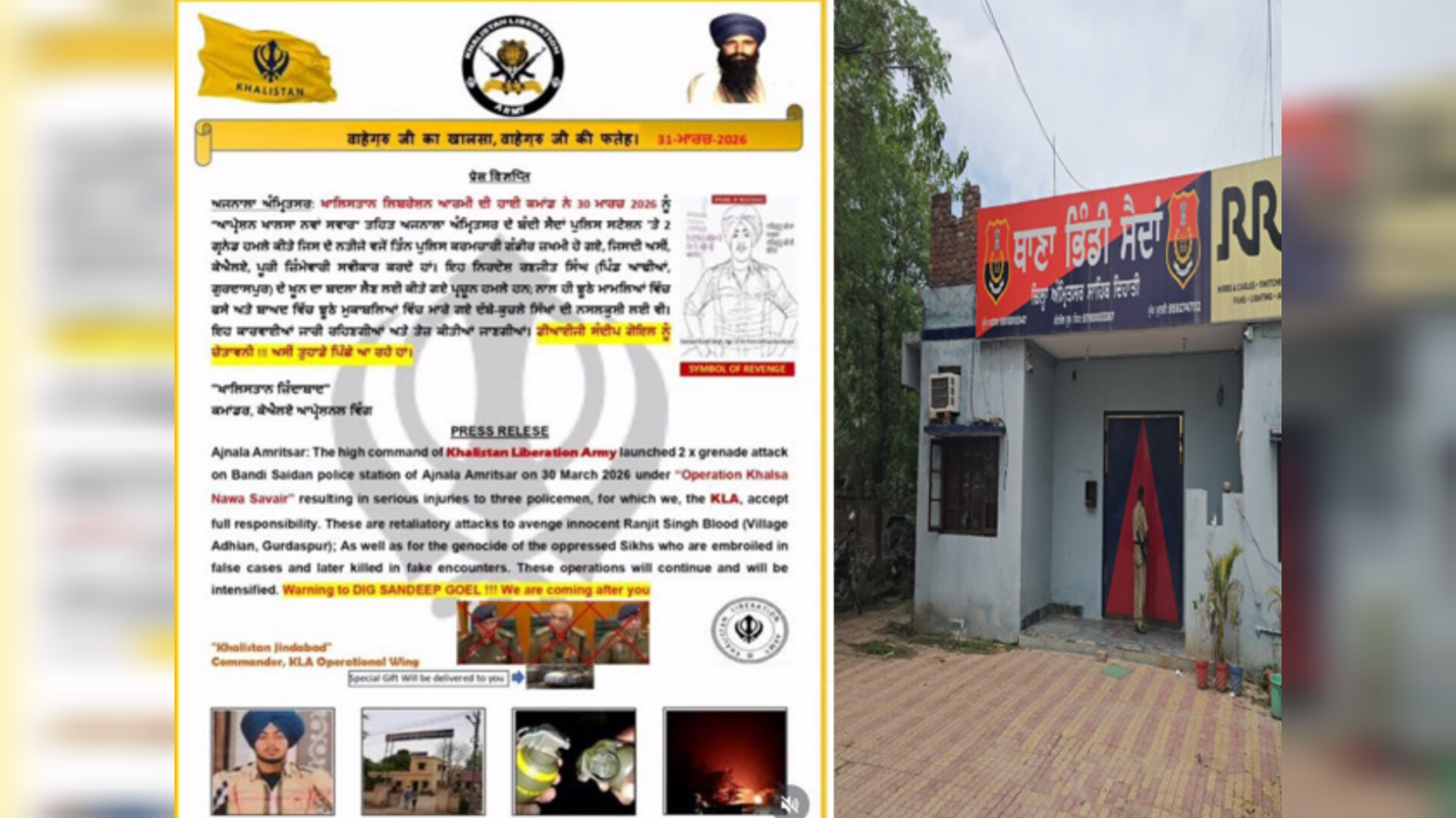 ਵਾਇਰਲ ਪੱਤਰ ਵਿੱਚ ਲਿਖਿਆ ਗਿਆ ਹੈ ਕਿ “ਖਾਲਿਸਤਾਨ ਲਿਬਰੇਸ਼ਨ ਆਰਮੀ” ਦੀ ਹਾਈਕਮਾਂਡ ਵੱਲੋਂ 30 ਮਾਰਚ ਨੂੰ ‘ਆਪ੍ਰੇਸ਼ਨ ਖਾਲਸਾ ਨਵਾਂ ਸਵਾਰ’ ਦੇ ਤਹਿਤ ਭਿੰਡੀ ਸੈਦਾਂ ਪੁਲਿਸ ਸਟੇਸ਼ਨ ਨੂੰ ਨਿਸ਼ਾਨਾ ਬਣਾਇਆ ਗਿਆ। ਪੱਤਰ ਅਨੁਸਾਰ ਇਸ ਕਾਰਵਾਈ ਦੌਰਾਨ ਦੋ ਗ੍ਰਨੇਡ ਹਮਲੇ ਕੀਤੇ ਗਏ ਅਤੇ ਇਸ ਦੀ ਪੂਰੀ ਜ਼ਿੰਮੇਵਾਰੀ ਸੰਗਠਨ ਵੱਲੋਂ ਸਵੀਕਾਰ ਕੀਤੀ ਗਈ ਹੈ।