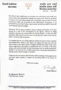 ਚੰਡੀਗੜ੍ਹ :- ਪੰਜਾਬ ਭਾਜਪਾ ਦੇ ਸੂਬਾ ਪ੍ਰਧਾਨ ਸੁਨੀਲ ਜਾਖੜ ਨੇ ਨਸ਼ੀਲੇ ਕਾਰੋਬਾਰ ਦੇ ਪਿੱਛੇ ਲੁਕੇ ਪੈਸੇ ਦੇ ਸਰੋਤਾਂ ਨੂੰ ਬੇਨਕਾਬ ਕਰਨ ਲਈ ਮੁੱਖ ਮੰਤਰੀ ਭਗਵੰਤ ਮਾਨ ਨੂੰ ਵਿਸ਼ੇਸ਼ ਪੱਤਰ ਲਿਖ ਕੇ ਤੁਰੰਤ ਕਦਮ ਚੁੱਕਣ ਦੀ ਅਪੀਲ ਕੀਤੀ ਹੈ।