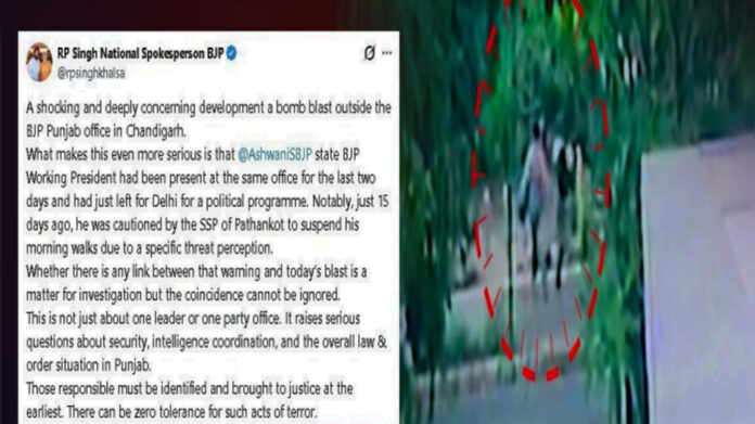 ਚੰਡੀਗੜ੍ਹ :- ਚੰਡੀਗੜ੍ਹ ਵਿੱਚ ਹੋਏ ਧਮਾਕੇ ਨੂੰ ਲੈ ਕੇ ਭਾਰਤੀ ਜਨਤਾ ਪਾਰਟੀ ਵੱਲੋਂ ਗੰਭੀਰ ਦਾਅਵਾ ਸਾਹਮਣੇ ਆਇਆ ਹੈ। ਪਾਰਟੀ ਦੇ ਆਗੂ ਆਰ.ਪੀ. ਸਿੰਘ ਨੇ ਸੋਸ਼ਲ ਮੀਡੀਆ ‘ਤੇ ਜਾਣਕਾਰੀ ਸਾਂਝੀ ਕਰਦਿਆਂ ਕਿਹਾ ਕਿ ਇਸ ਹਮਲੇ ਦਾ ਅਸਲ ਨਿਸ਼ਾਨਾ ਭਾਜਪਾ ਦੇ ਸੀਨੀਅਰ ਨੇਤਾ ਅਸ਼ਵਨੀ ਸ਼ਰਮਾ ਸਨ। ਉਨ੍ਹਾਂ ਮੁਤਾਬਕ ਅਸ਼ਵਨੀ ਸ਼ਰਮਾ ਪਿਛਲੇ ਦੋ ਦਿਨਾਂ ਤੋਂ ਚੰਡੀਗੜ੍ਹ ਦਫਤਰ ਵਿੱਚ ਹੀ ਮੌਜੂਦ ਸਨ ਅਤੇ ਧਮਾਕੇ ਤੋਂ ਕੁਝ ਸਮਾਂ ਪਹਿਲਾਂ ਹੀ ਦਿੱਲੀ ਲਈ ਰਵਾਨਾ ਹੋਏ ਸਨ, ਜਿਸ ਨਾਲ ਵੱਡੀ ਘਟਨਾ ਟਲ ਗਈ।