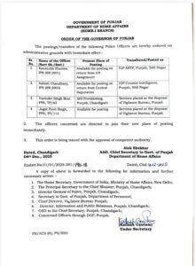 ਗ੍ਰਹਿ ਵਿਭਾਗ ਦੇ ਨੋਟੀਫਿਕੇਸ਼ਨ ਵਿੱਚ ਸਪਸ਼ਟ ਕੀਤਾ ਗਿਆ ਹੈ ਕਿ ਸਾਰੇ ਚਾਰ ਅਧਿਕਾਰੀ ਆਪਣੀ ਨਵੀਂ ਤਾਇਨਾਤੀ ‘ਤੇ ਤੁਰੰਤ ਚਾਰਜ ਸੰਭਾਲਣ, ਤਾਂ ਜੋ ਕੰਮਕਾਜ ਵਿੱਚ ਕੋਈ ਰੁਕਾਵਟ ਨਾ ਆਵੇ।