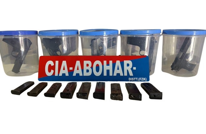 ਫ਼ਾਜ਼ਿਲਕਾ :- ਫ਼ਾਜ਼ਿਲਕਾ ਪੁਲਿਸ ਨੇ ਸਰਹੱਦੀ ਇਲਾਕੇ ‘ਚ ਅੰਤਰਰਾਸ਼ਟਰੀ ਹਥਿਆਰ ਤਸਕਰੀ ਗਿਰੋਹ ਨੂੰ ਬੇਨਕਾਬ ਕਰਦਿਆਂ ਵੱਡੀ ਕਾਮਯਾਬੀ ਹਾਸਲ ਕੀਤੀ ਹੈ। ਖ਼ੁਫ਼ੀਆ ਸੂਚਨਾ ਦੇ ਆਧਾਰ ‘ਤੇ ਪੁਲਿਸ ਨੇ ਕਾਰਵਾਈ ਕਰਕੇ ਦੋ ਸ਼ਖ਼ਸਾਂ ਨੂੰ ਗ੍ਰਿਫ਼ਤਾਰ ਕੀਤਾ। ਗ੍ਰਿਫ਼ਤਾਰ ਕੀਤੇ ਮੁਲਜ਼ਮਾਂ ਦੀ ਪਛਾਣ ਸੁਰਿੰਦਰ ਸਿੰਘ ਤੇ ਗੁਰਪ੍ਰੀਤ ਵਜੋਂ ਹੋਈ ਹੈ। ਉਨ੍ਹਾਂ ਦੇ ਕਬਜ਼ੇ ਵਿਚੋਂ ਪੰਜ ਵਿਦੇਸ਼ੀ ਬਣੀਆਂ .30 ਬੋਰ ਪਿਸਤੌਲਾਂ ਤੇ ਨੌ ਮੈਗਜ਼ੀਨ ਬਰਾਮਦ ਹੋਈਆਂ।