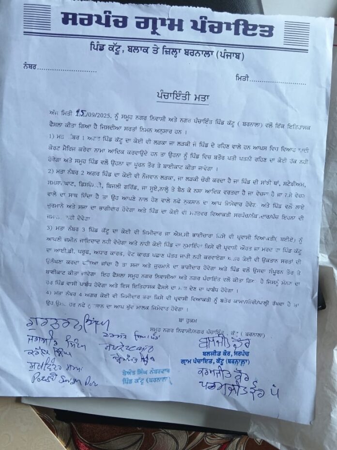 ਬਰਨਾਲਾ :- ਪੰਜਾਬ ਦੇ ਕਈ ਇਲਾਕਿਆਂ ਵਿੱਚ ਪ੍ਰਵਾਸੀ ਮਜ਼ਦੂਰਾਂ ਦੇ ਖ਼ਿਲਾਫ਼ ਪੰਚਾਇਤਾਂ ਵੱਲੋਂ ਮਤੇ ਪਾਉਣ ਦਾ ਸਿਲਸਿਲਾ ਰੁਕਣ ਦਾ ਨਾਮ ਨਹੀਂ ਲੈ ਰਿਹਾ। ਬਠਿੰਡਾ ਅਤੇ ਹੁਸ਼ਿਆਰਪੁਰ ਮਗਰੋਂ ਹੁਣ ਬਰਨਾਲਾ ਦੇ ਪਿੰਡ ਕੱਟੂ ਦੀ ਪੰਚਾਇਤ ਨੇ ਵੀ ਪ੍ਰਵਾਸੀ ਮਜ਼ਦੂਰਾਂ ਦਾ ਬਾਈਕਾਟ ਐਲਾਨਿਆ ਹੈ।