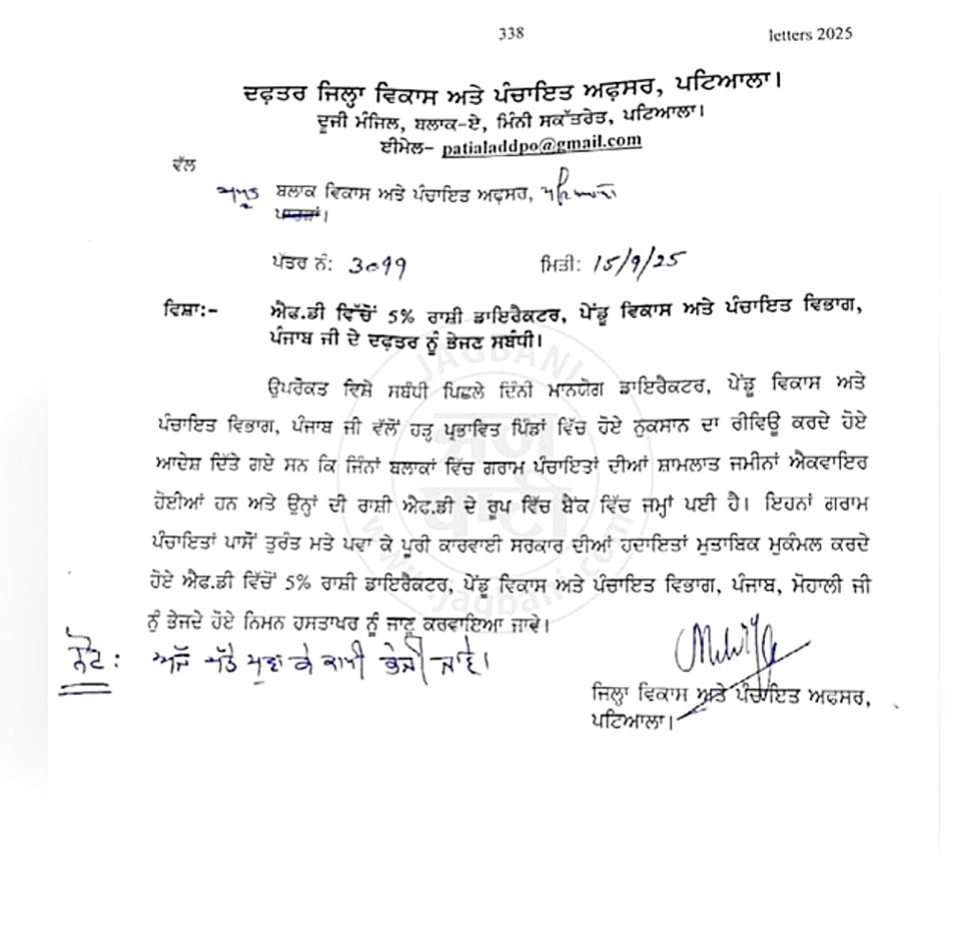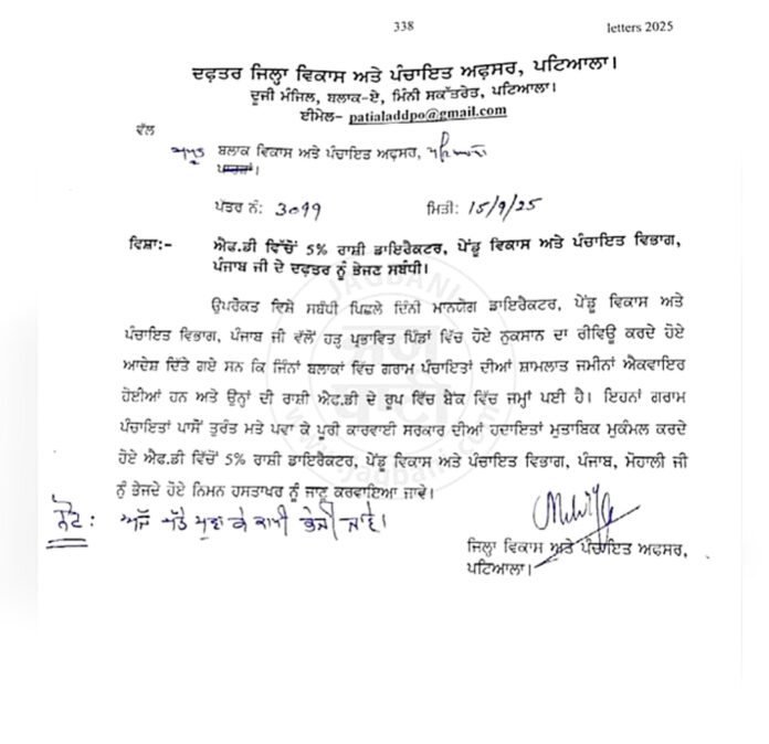 ਪਟਿਆਲਾ :- ਪਟਿਆਲਾ ਤੋਂ ਜ਼ਿਲ੍ਹਾ ਵਿਕਾਸ ਅਤੇ ਪੰਚਾਇਤ ਅਫ਼ਸਰ ਵੱਲੋਂ ਇਕ ਮਹੱਤਵਪੂਰਣ ਹੁਕਮ ਜਾਰੀ ਹੋਇਆ ਹੈ। ਇਸ ਵਿੱਚ ਪੱਤਰ ਨੰਬਰ 3099 ਦਾ ਹਵਾਲਾ ਦਿੰਦਿਆਂ ਆਦੇਸ਼ ਦਿੱਤਾ ਗਿਆ ਹੈ ਕਿ ਗ੍ਰਾਂਮ ਪੰਚਾਇਤਾਂ ਦੀਆਂ ਸ਼ਾਮਲਾਤ ਜ਼ਮੀਨਾਂ ਦੇ ਮੁਆਵਜ਼ੇ ਵਜੋਂ ਬੈਂਕਾਂ ਵਿਚ ਜਮ੍ਹਾਂ ਕਰਵਾਈਆਂ ਐੱਫ.ਡੀਜ਼ ’ਚੋਂ 5 ਫੀਸਦੀ ਰਕਮ ਭੇਜੀ ਜਾਵੇ।