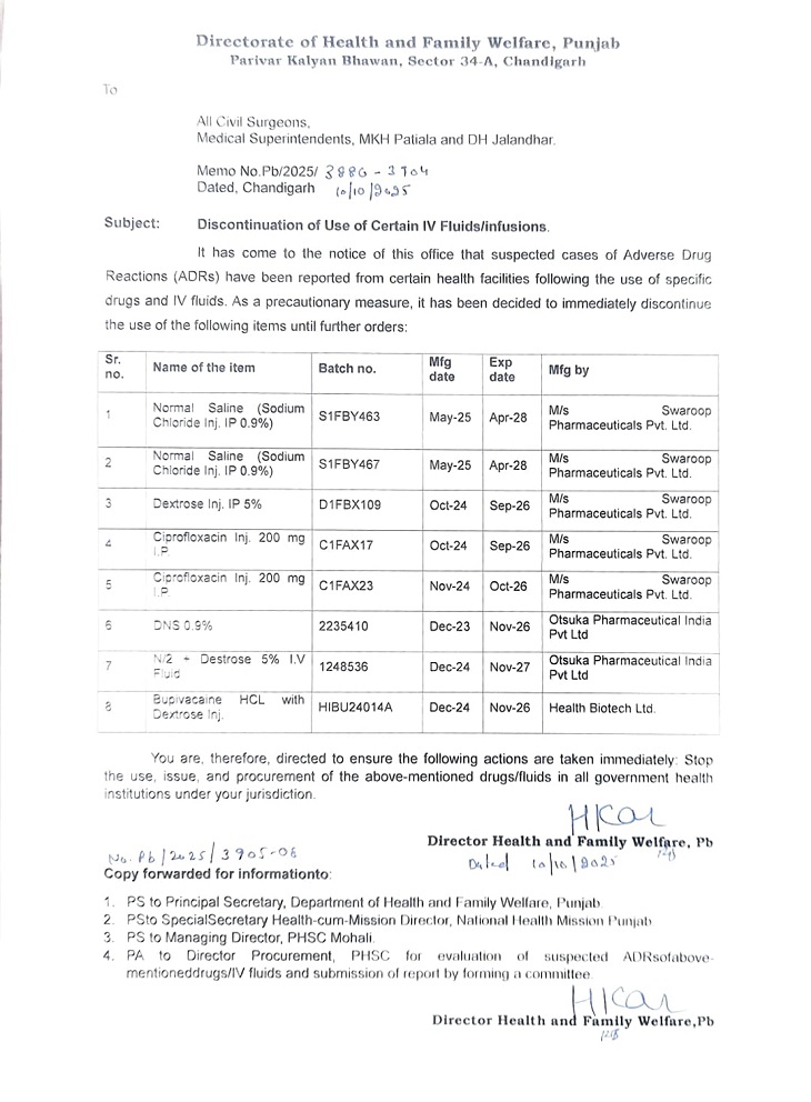 ਚੰਡੀਗੜ੍ਹ :- ਪੰਜਾਬ ਸਰਕਾਰ ਨੇ ਕੋਲਡਰਿਫ ਖੰਘ ਦੇ ਸਿਰਪ ‘ਤੇ ਪਾਬੰਦੀ ਤੋਂ ਬਾਅਦ ਸੂਬੇ ਵਿੱਚ ਅੱਠ ਹੋਰ ਦਵਾਈਆਂ ਦੀ ਵਰਤੋਂ ‘ਤੇ ਰੋਕ ਲਗਾ ਦਿੱਤੀ ਹੈ। ਉਨ੍ਹਾਂ ਦੀ ਖਰੀਦ ‘ਤੇ ਵੀ ਪਾਬੰਦੀ ਜਾਰੀ ਕਰ ਦਿੱਤੀ ਗਈ ਹੈ। ਇਹ ਹੁਕਮ ਸਿਹਤ ਅਤੇ ਪਰਿਵਾਰ ਭਲਾਈ ਡਾਇਰੈਕਟੋਰੇਟ ਵੱਲੋਂ ਜਾਰੀ ਕੀਤਾ ਗਿਆ ਹੈ।