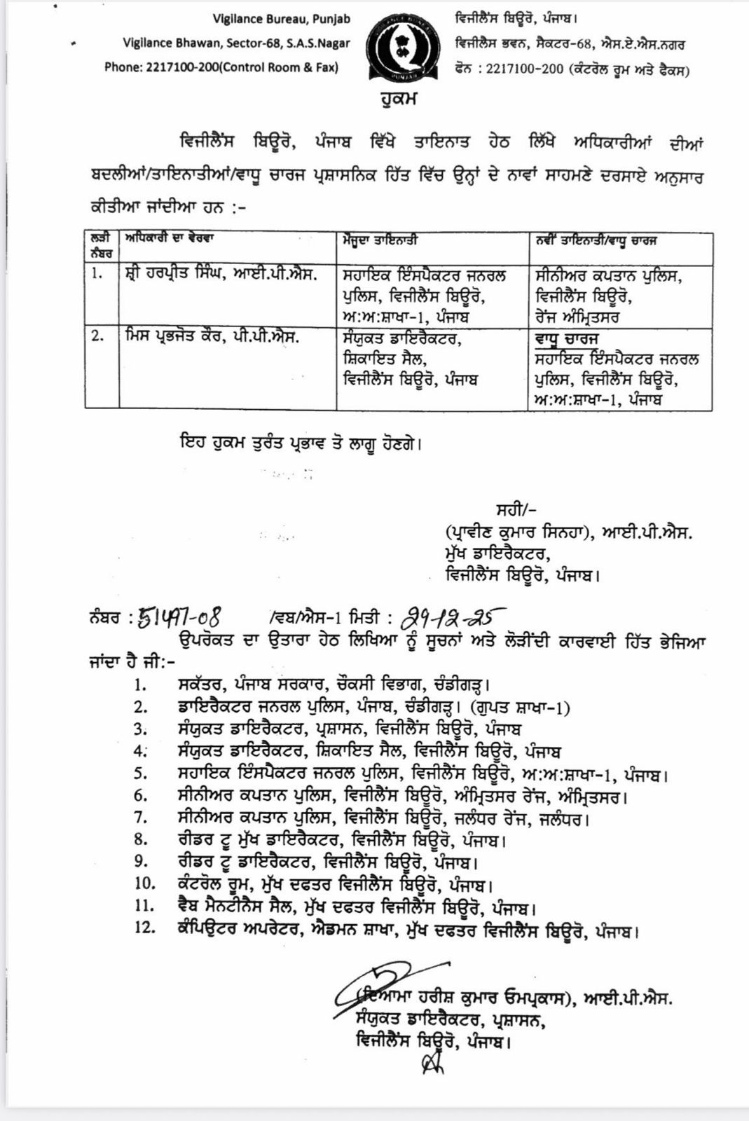 ਸਰਕਾਰ ਵੱਲੋਂ ਜਾਰੀ ਹੁਕਮਾਂ ਅਨੁਸਾਰ ਆਈਪੀਐਸ ਅਧਿਕਾਰੀ ਹਰਪ੍ਰੀਤ ਸਿੰਘ ਨੂੰ ਅੰਮ੍ਰਿਤਸਰ ਵਿਜੀਲੈਂਸ ਰੇਂਜ ਦਾ ਐਸਐਸਪੀ ਲਗਾਇਆ ਗਿਆ ਹੈ। ਇਹ ਤਬਾਦਲਾ ਤੁਰੰਤ ਪ੍ਰਭਾਵ ਨਾਲ ਲਾਗੂ ਕੀਤਾ ਗਿਆ ਹੈ ਅਤੇ ਉਨ੍ਹਾਂ ਤੋਂ ਉਮੀਦ ਜਤਾਈ ਜਾ ਰਹੀ ਹੈ ਕਿ ਵਿਜੀਲੈਂਸ ਕਾਰਵਾਈਆਂ ਨੂੰ ਹੋਰ ਮਜ਼ਬੂਤ ਕੀਤਾ ਜਾਵੇਗਾ।