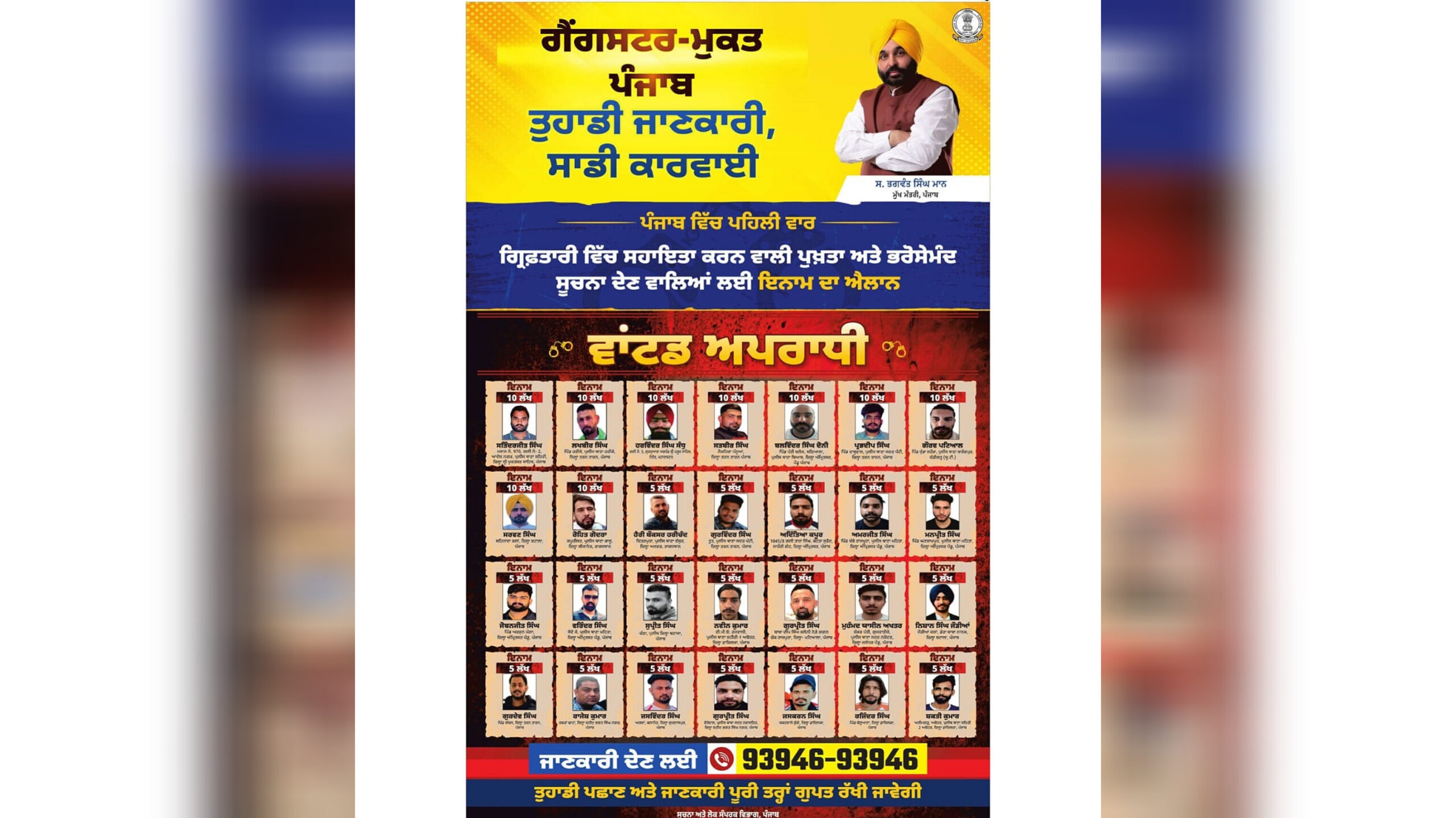 ਪੋਸਟਰ ‘ਤੇ ਦਰਜ ਨਾਅਰਾ “ਗੈਂਗਸਟਰ ਮੁਕਤ ਪੰਜਾਬ, ਤੁਹਾਡੀ ਜਾਣਕਾਰੀ ਸਾਡੀ ਕਾਰਵਾਈ” ਸਰਕਾਰ ਦੇ ਮਕਸਦ ਨੂੰ ਸਪੱਸ਼ਟ ਕਰਦਾ ਹੈ। ਇਸ ਤਰ੍ਹਾਂ ਦੀ ਪਹਿਲ ਨਾਲ ਉਮੀਦ ਜਤਾਈ ਜਾ ਰਹੀ ਹੈ ਕਿ ਸੂਬੇ ਵਿੱਚ ਅਪਰਾਧੀ ਗਤੀਵਿਧੀਆਂ ‘ਤੇ ਲਗਾਮ ਲੱਗੇਗੀ ਅਤੇ ਲੋਕਾਂ ਦੀ ਸੁਰੱਖਿਆ ਹੋਰ ਮਜ਼ਬੂਤ ਹੋਵੇਗੀ।