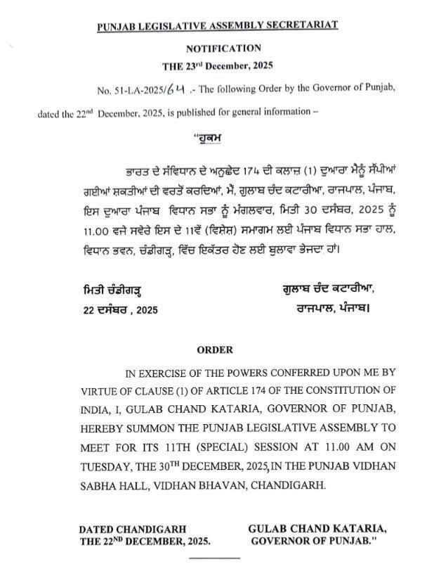 ਪੰਜਾਬ ਵਿਧਾਨ ਸਭਾ ਦਾ ਵਿਸ਼ੇਸ਼ ਸੈਸ਼ਨ 30 ਦਸੰਬਰ ਨੂੰ, ਰਾਜਪਾਲ ਗੁਲਾਬ ਚੰਦ ਕਟਾਰੀਆ ਨੇ ਦਿੱਤੀ ਮਨਜ਼ੂਰੀ