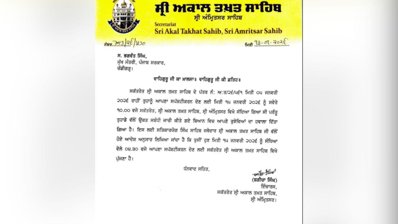 ਅਕਾਲ ਤਖ਼ਤ ਸਾਹਿਬ ਵੱਲੋਂ ਮੁੱਖ ਮੰਤਰੀ ਤੋਂ ਉਨ੍ਹਾਂ ਦੇ ਕੁਝ ਜਨਤਕ ਬਿਆਨਾਂ ਅਤੇ ਸੋਸ਼ਲ ਮੀਡੀਆ ’ਤੇ ਵਾਇਰਲ ਹੋ ਰਹੀ ਵੀਡੀਓ ਸਬੰਧੀ ਸਪੱਸ਼ਟੀਕਰਨ ਮੰਗਿਆ ਗਿਆ ਹੈ। ਇਸ ਮਾਮਲੇ ਦੀ ਗੰਭੀਰਤਾ ਨੂੰ ਦੇਖਦੇ ਹੋਏ ਪੇਸ਼ੀ ਨਿਸ਼ਚਿਤ ਕੀਤੀ ਗਈ ਹੈ।