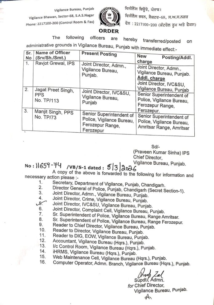ਚੰਡੀਗੜ੍ਹ :- ਪੰਜਾਬ ਸਰਕਾਰ ਵੱਲੋਂ ਪ੍ਰਸ਼ਾਸਕੀ ਢਾਂਚੇ ਵਿੱਚ ਤਬਦੀਲੀਆਂ ਦਾ ਸਿਲਸਿਲਾ ਲਗਾਤਾਰ ਜਾਰੀ ਹੈ। ਤਾਜ਼ਾ ਜਾਰੀ ਕੀਤੇ ਗਏ ਸਰਕਾਰੀ ਹੁਕਮਾਂ ਮੁਤਾਬਕ ਇਕ ਆਈ.ਪੀ.ਐਸ ਅਤੇ ਦੋ ਪੀ.ਪੀ.ਐਸ ਅਧਿਕਾਰੀਆਂ ਦੇ ਤਬਾਦਲੇ ਕੀਤੇ ਗਏ ਹਨ। ਸਰਕਾਰ ਵੱਲੋਂ ਇਹ ਫੈਸਲਾ ਪ੍ਰਸ਼ਾਸਕੀ ਕੰਮਕਾਜ ਨੂੰ ਹੋਰ ਪ੍ਰਭਾਵਸ਼ਾਲੀ ਬਣਾਉਣ ਅਤੇ ਵੱਖ-ਵੱਖ ਵਿਭਾਗਾਂ ਵਿੱਚ ਜ਼ਿੰਮੇਵਾਰੀਆਂ ਦੀ ਨਵੀਂ ਵੰਡ ਕਰਨ ਲਈ ਲਿਆ ਗਿਆ ਹੈ। ਅਧਿਕਾਰੀਆਂ ਦੀ ਨਵੀਂ ਤਾਇਨਾਤੀ ਸੰਬੰਧੀ ਵਿਸਥਾਰਿਤ ਸੂਚੀ ਵੀ ਜਾਰੀ ਕਰ ਦਿੱਤੀ ਗਈ ਹੈ, ਜਿਸ ਵਿੱਚ ਉਨ੍ਹਾਂ ਦੇ ਨਵੇਂ ਅਹੁਦੇ ਅਤੇ ਤਾਇਨਾਤੀ ਵਾਲੇ ਸਥਾਨ ਦਰਜ ਹਨ। ਸਰਕਾਰੀ ਸਰੋਤਾਂ ਅਨੁਸਾਰ ਇਹ ਤਬਾਦਲੇ ਤੁਰੰਤ ਪ੍ਰਭਾਵ ਨਾਲ ਲਾਗੂ ਕਰ ਦਿੱਤੇ ਗਏ ਹਨ।