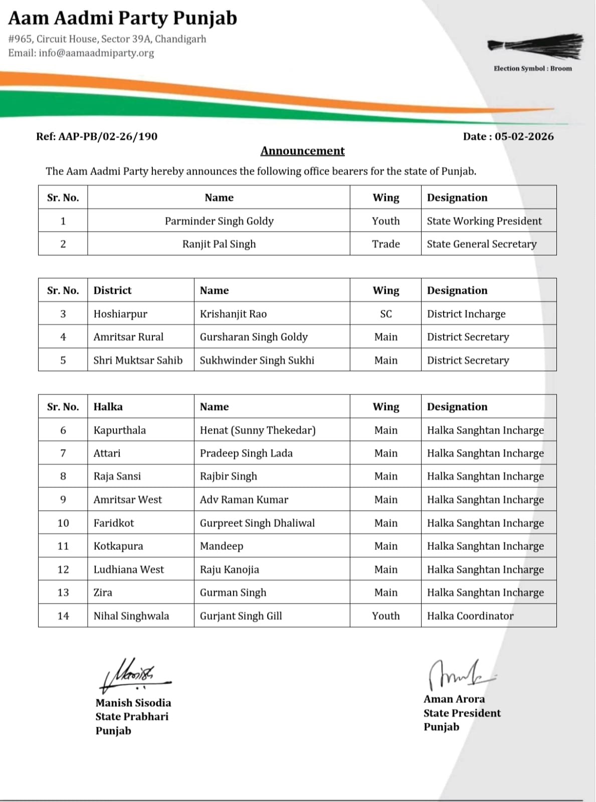 ‘ਆਪ’ ਨੇ ਪੰਜਾਬ ਵਿੱਚ ਸੰਗਠਨ ਦੀ ਨਵੀਂ ਟੀਮ ਬਣਾਈ; ਗੋਲਡੀ ਨੂੰ ਯੂਥ ਵਿੰਗ ਦੀ ਜ਼ਿੰਮੇਵਾਰੀ, ਰਣਜੀਤ ਪਾਲ ਸਿੰਘ ਵਪਾਰ ਵਿੰਗ ਦੇ ਜਨਰਲ ਸਕੱਤਰ, ਦੇਖੋ ਲਿਸਟਾਂ….