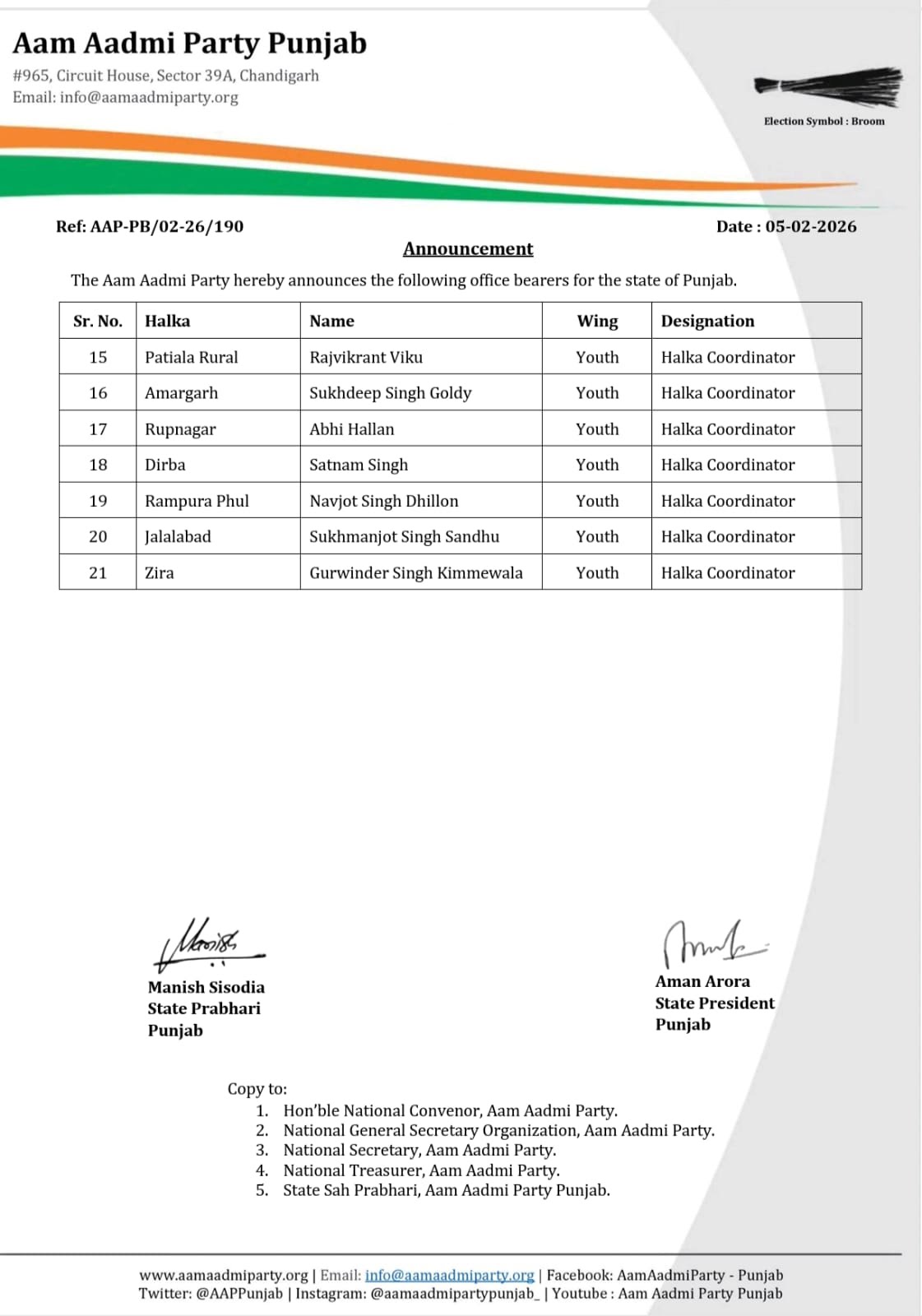 ਇਸ ਦੇ ਨਾਲ ਹੀ ਵਪਾਰੀਆਂ ਅਤੇ ਉਦਯੋਗਿਕ ਵਰਗ ਦੀ ਭੂਮਿਕਾ ਨੂੰ ਮਜ਼ਬੂਤ ਕਰਨ ਲਈ ਰਣਜੀਤ ਪਾਲ ਸਿੰਘ ਨੂੰ ਵਪਾਰ ਵਿੰਗ ਦਾ ਸੂਬਾ ਜਨਰਲ ਸਕੱਤਰ ਨਿਯੁਕਤ ਕੀਤਾ ਗਿਆ ਹੈ। ਪਾਰਟੀ ਨੇ ਉਮੀਦ ਜਤਾਈ ਹੈ ਕਿ ਦੋਵੇਂ ਆਗੂ ਆਪਣੇ-ਆਪਣੇ ਖੇਤਰਾਂ ਵਿੱਚ ਸੰਗਠਨ ਨੂੰ ਨਵੀਂ ਰਫ਼ਤਾਰ ਦੇਣਗੇ ਅਤੇ ਪਾਰਟੀ ਦੀ ਨੀਤੀ ਨੂੰ ਜਨਤਾ ਤੱਕ ਪ੍ਰਭਾਵਸ਼ਾਲੀ ਢੰਗ ਨਾਲ ਪਹੁੰਚਾਉਣਗੇ।