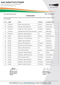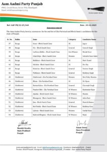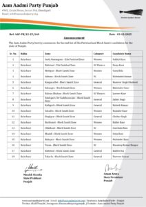 ਚੰਡੀਗੜ੍ਹ :- ਪੰਜਾਬ ਵਿੱਚ ਜ਼ਿਲ੍ਹਾ ਪ੍ਰੀਸ਼ਦ ਅਤੇ ਬਲਾਕ (ਪੰਚਾਇਤ) ਸੰਮਤੀ ਚੋਣਾਂ ਲਈ ਰਾਜਨੀਤਿਕ ਗਤੀਵਿਧੀਆਂ ਤੇਜ਼ ਹੋ ਗਈਆਂ ਹਨ। ਨਾਮਜ਼ਦਗੀਆਂ 4 ਦਸੰਬਰ ਤੱਕ ਭਰਨੀਆਂ ਹਨ ਅਤੇ ਇਸ ਦੇ ਮੱਦੇਨਜ਼ਰ ਆਮ ਆਦਮੀ ਪਾਰਟੀ ਨੇ ਆਪਣੇ ਉਮੀਦਵਾਰਾਂ ਦੀ ਦੂਜੀ ਵੱਡੀ ਸੂਚੀ ਜਾਰੀ ਕਰਕੇ ਚੋਣੀ ਤਿਆਰੀਆਂ ਨੂੰ ਹੌਰ ਰਫ਼ਤਾਰ ਦੇ ਦਿੱਤੀ ਹੈ।