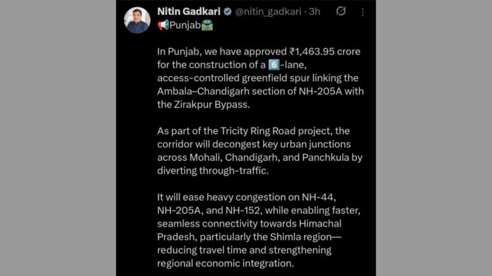 ਚੰਡੀਗੜ੍ਹ :- ਟ੍ਰਾਈਸਿਟੀ ਦੇ ਵਸਨੀਕਾਂ ਲਈ ਮਹੱਤਵਪੂਰਨ ਸੁਨੇਹਾ ਸਾਹਮਣੇ ਆਇਆ ਹੈ। ਕੇਂਦਰ ਸਰਕਾਰ ਨੇ ਪੰਜਾਬ ਅੰਦਰ ਇੱਕ 6-ਲੇਨ ਐਕਸੈਸ-ਕੰਟਰੋਲਡ ਗ੍ਰੀਨਫੀਲਡ ਸਪਰ ਬਣਾਉਣ ਲਈ 1,463.95 ਕਰੋੜ ਰੁਪਏ ਦੀ ਮਨਜ਼ੂਰੀ ਦਿੱਤੀ ਹੈ। ਇਹ ਨਵਾਂ ਰਾਹ NH-205A ਦੇ ਅੰਬਾਲਾ-ਚੰਡੀਗੜ੍ਹ ਹਿੱਸੇ ਨੂੰ ਜ਼ੀਰਕਪੁਰ ਬਾਈਪਾਸ ਨਾਲ ਜੋੜੇਗਾ ਅਤੇ ਟ੍ਰਾਈਸਿਟੀ ਰਿੰਗ ਰੋਡ ਯੋਜਨਾ ਦਾ ਕੇਂਦਰੀ ਅੰਗ ਬਣੇਗਾ। ਇਸ ਨਾਲ ਬਾਹਰੀ ਟ੍ਰੈਫਿਕ ਨੂੰ ਸ਼ਹਿਰੀ ਸੀਮਾਵਾਂ ਤੋਂ ਬਿਨਾਂ ਲੰਘਣ ਦੀ ਸਹੂਲਤ ਮਿਲੇਗੀ।