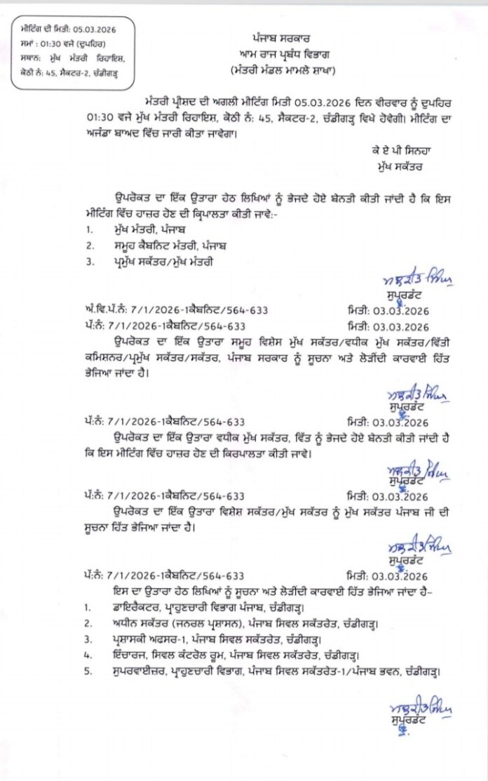 ਸਰਕਾਰੀ ਪੱਤਰ ਵਿੱਚ ਸਪਸ਼ਟ ਕੀਤਾ ਗਿਆ ਹੈ ਕਿ ਸੰਬੰਧਤ ਵਿਭਾਗਾਂ ਦੇ ਮੰਤਰੀਆਂ ਦੇ ਨਾਲ-ਨਾਲ ਮੁੱਖ ਸਕੱਤਰ, ਵਿੱਤ ਕਮਿਸ਼ਨਰ ਅਤੇ ਹੋਰ ਸੀਨੀਅਰ ਅਧਿਕਾਰੀਆਂ ਨੂੰ ਵੀ ਬੈਠਕ ਵਿੱਚ ਹਾਜ਼ਰ ਰਹਿਣ ਲਈ ਕਿਹਾ ਗਿਆ ਹੈ, ਤਾਂ ਜੋ ਅਹਿਮ ਮਸਲਿਆਂ ‘ਤੇ ਤੁਰੰਤ ਫ਼ੈਸਲੇ ਲਏ ਜਾ ਸਕਣ।